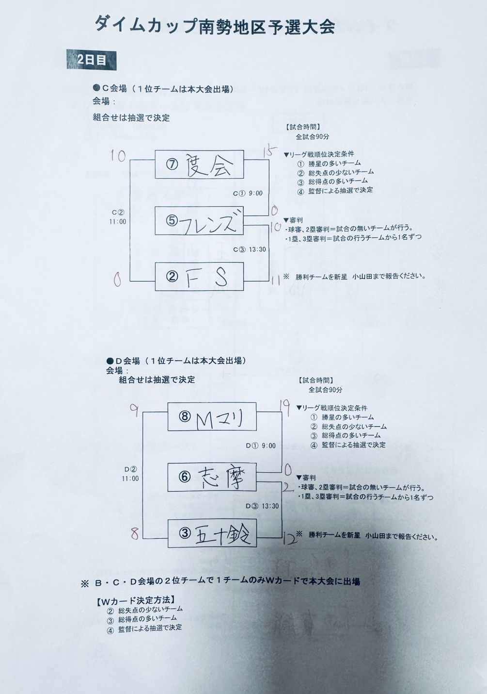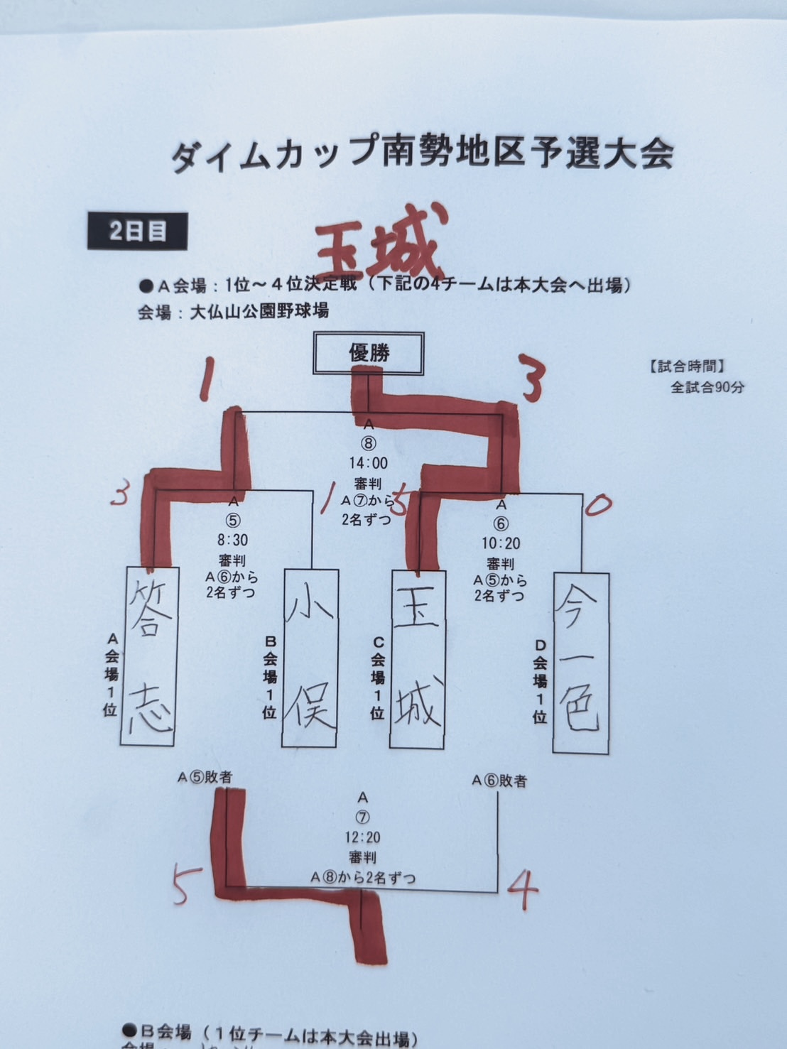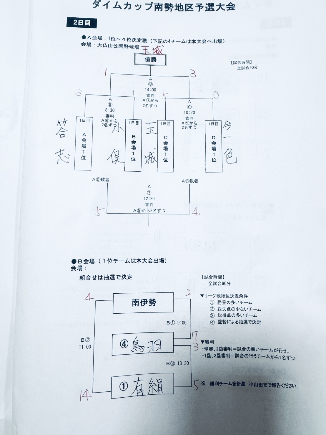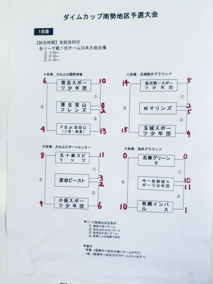 ダイムカップ南勢地区予選大会結果 試合 2025.11.24 【ダイムカップ南勢地区予選大会結果】 優 勝 玉城準優勝 答志三 位 小俣四 位 今一色五 位 度会六 位 有緝七 位 マリンズ八 位 鳥羽